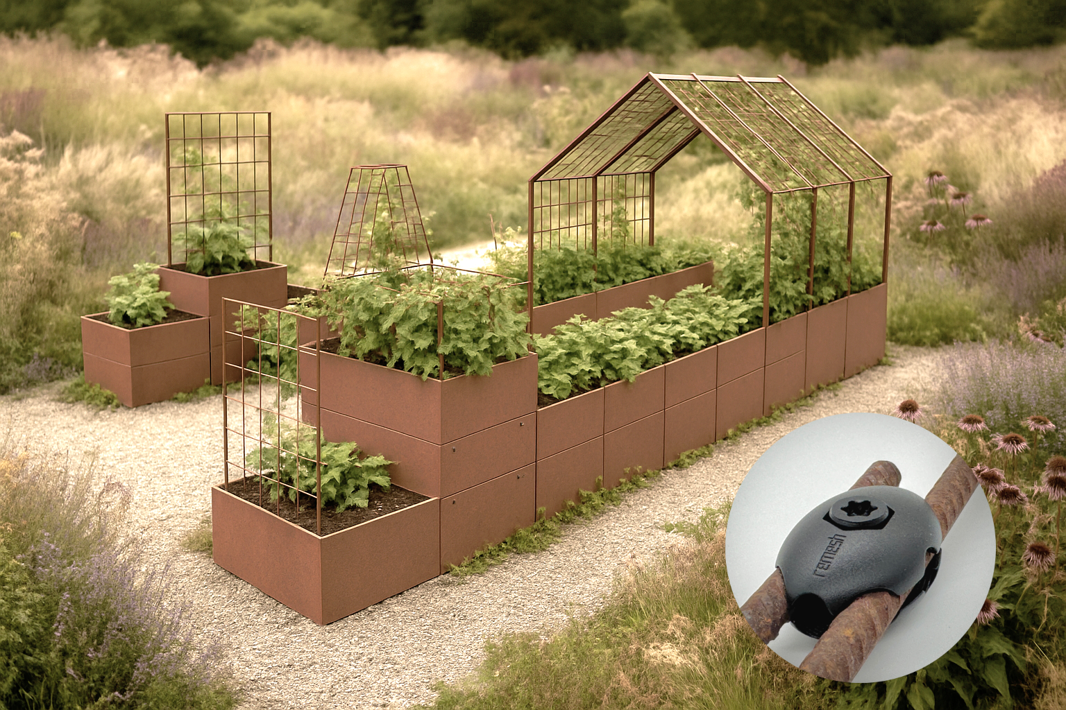 Das Hochbeetsystem überzeugt durch sein intelligentes Modulsystem und die Verwendung von hochwertigem Cortenstahl. Die Seitenwände werden einfach in stabile Säulen eingesteckt und lassen sich beliebig erweitern. Dank eines speziellen Vertikal-Verbinders sind die Module stapelbar und ermöglichen ergonomische Arbeitshöhen. Dabei ergeben drei übereinander gesetzte Elemente beispielsweise eine komfortable, rückenschonende Höhe von 90 cm. Integrierbare Bewässerungslösungen, bis zu 100 kg belastbare Einlegeböden mit Drainageöffnungen sowie die Kombinierbarkeit mit remesh eröffnen zusätzliche funktionale und gestalterische Möglichkeiten, wie die Integration von Rankhilfen oder Schattenspendern.